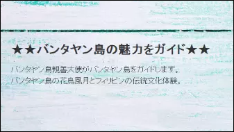 都会暮らしにストレスを感じて「ああ、やってられない」と思ったらバンタヤン島に来ればいい。自然のパワーが心と体を癒やしてくれる。高い施設や設備など要らない。自然はお金を取らない。都会が産んだストレスを高いお金を払って都会に直してもらうなど馬鹿げている。バンタヤン島のすきとおった風、常夏でも冷たさを感じる青いそら、うつくしいココナツの森に囲まれたどこか懐かしいサンタフェの市街、海辺のぎらぎらひかる白い砂。またそのなかで働く島びとたち、日焼けた顔のこどもたち、日暮れて飲むキンキンに冷えたビールと美味い焼き鳥に毎日生き返る。